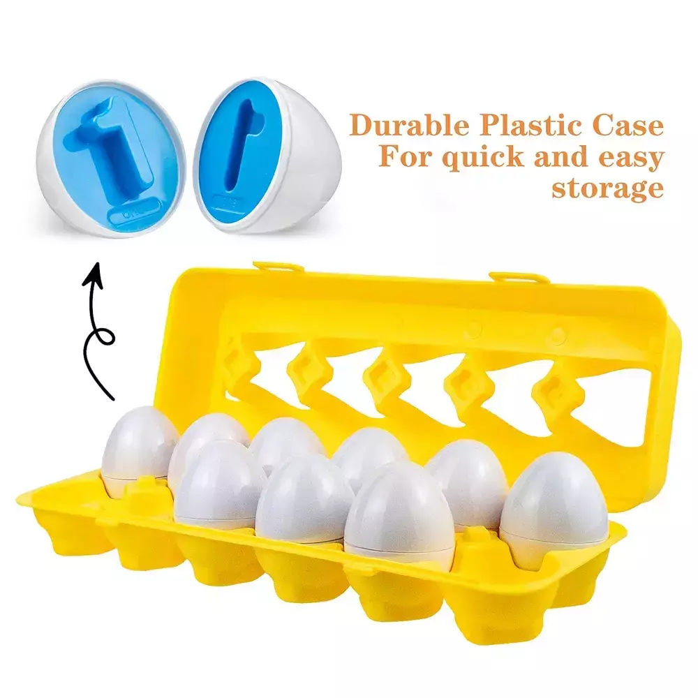Cada huevo está compuesto por dos mitades que esconden en su interior un número en 3D, permitiendo a los niños aprender a combinar objetos por color y forma. Este diseño interactivo fomenta la concentración, la coordinación ojo-mano y el reconocimiento de números y figuras, ideales para el desarrollo temprano según el método Montessori y el currículo preescolar.